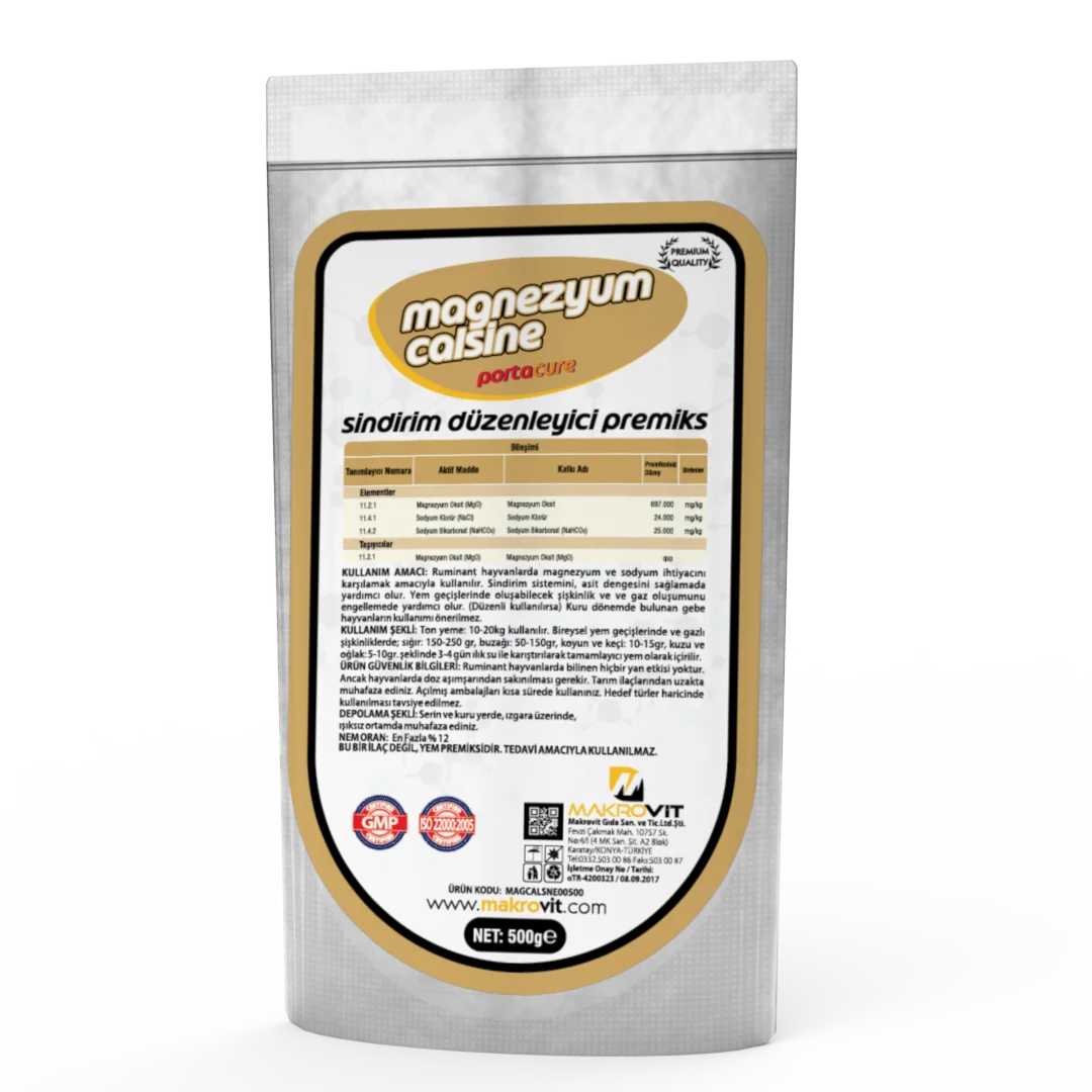 KULLANIM AMACI: Kuru döneminde olmayan gebe hayvanlar da dahil olmak üzere ruminantlarda, ihtiyaç duyulan magnezyum ve sodyumu sağlar. Sindirimi kolaylaştırmaya ve asit dengesini korumaya yardımcı olur. Yem geçişlerinde oluşabilecek şişkinliği ve gaz oluşumunu azaltır. KULLANIM ŞEKLİ: 1 ton yeme 10-20 kg kullanılır. Bireysel yem geçişlerinde ve gazlı şişkinliklerde; Sığır: 150-250g Buzağı : 50-150g Koyun-Keçi : 10-15gr Kuzu-OğIak : 5-10 gr ağızdan ılık içme suyuna karıştırılarak 3-4 gün verilir. Kuru dönemdeki gebe hayvanlarda kullanılması önerilmez.
