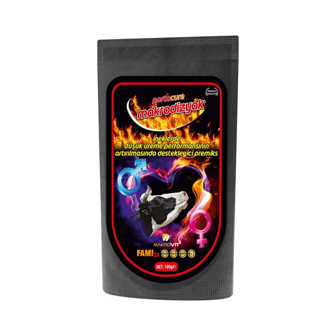 KULLANIM AMACI: Portacure makrodizyak yüksek düzeyde A, D ve E vitaminleri ve iz minenller içerir. İçeriğindeki vitamin ve mineraller bağışıklık sistemini destekler ve döl yatağı sağlığına olumlu etki yapar. İz mineraller, koenzim görevi gördükleri enzim sistemleri (Süperoksit dismutaz, glutatyon redüktaz, glutatyon peroksidaz, tioredoksin redüktaz seruloplazmin ve katalaz) ile hem üreme performansına hem de genel performans gelişimine katkıda bulunurlar. Ayrıca Portacure makrodizyak, fitoöstrojen içerir. Östrojenik etkiye sahip fitoöstrojenler gebe olmayan ineklerde ve gebelik sorunu yaşayan ineklerde üreme döngüsünün başlamasına, yenilenmesine ve yumurtlamaya katkı sağlayabilir. KULLANIM ŞEKLİ: Gebe olmayan inek ve düvelerde: 100 gr. Makrodizyak 2 It ılık şerbetli su ile içirilir. Gebe ve gebelik şüphesi olan hayv anlarda kesinli kle kullanılma malıdır. Bileşimi: Vitaminler Besinsel Yem Katkı Maddeleri: 3a300 Vitamin C (Askorbik asit) %12, Vitamin B12 (Siyanokobalamin) %0,002 3a672a Vitamin A (Retinol asetat) 10.000.000 IU* 3a671 Vitamin D3 (Kolekalsiferol) 2.000.000 IU* 3a700 Vitamin E (Alfa Tokoferol Asetat) %1,5, 3a820 Vitamin B1 (Tiyamin) %0,04 3a825i Vitamin B2 (Riboflavin) %0,04 3a831 Vitamin B6 (Piridoksin) %0,04 Vitamin Benzeri Maddeler / Besinsel Yem Katkı Maddeleri: İnositol%1. İz Mineraller / Besinsel Yem Katkı Maddeleri: 3b503 Mangan (Mangan Sülfat) %2, 3b605 Çinko (Çinko Sülfat) %2, 3b801 Selenyum (Sodyum Selenit) %0,0325, 3b305 Taşıyıcılar: Aromatik bitkiler. 1 Kg içindeki değerler.