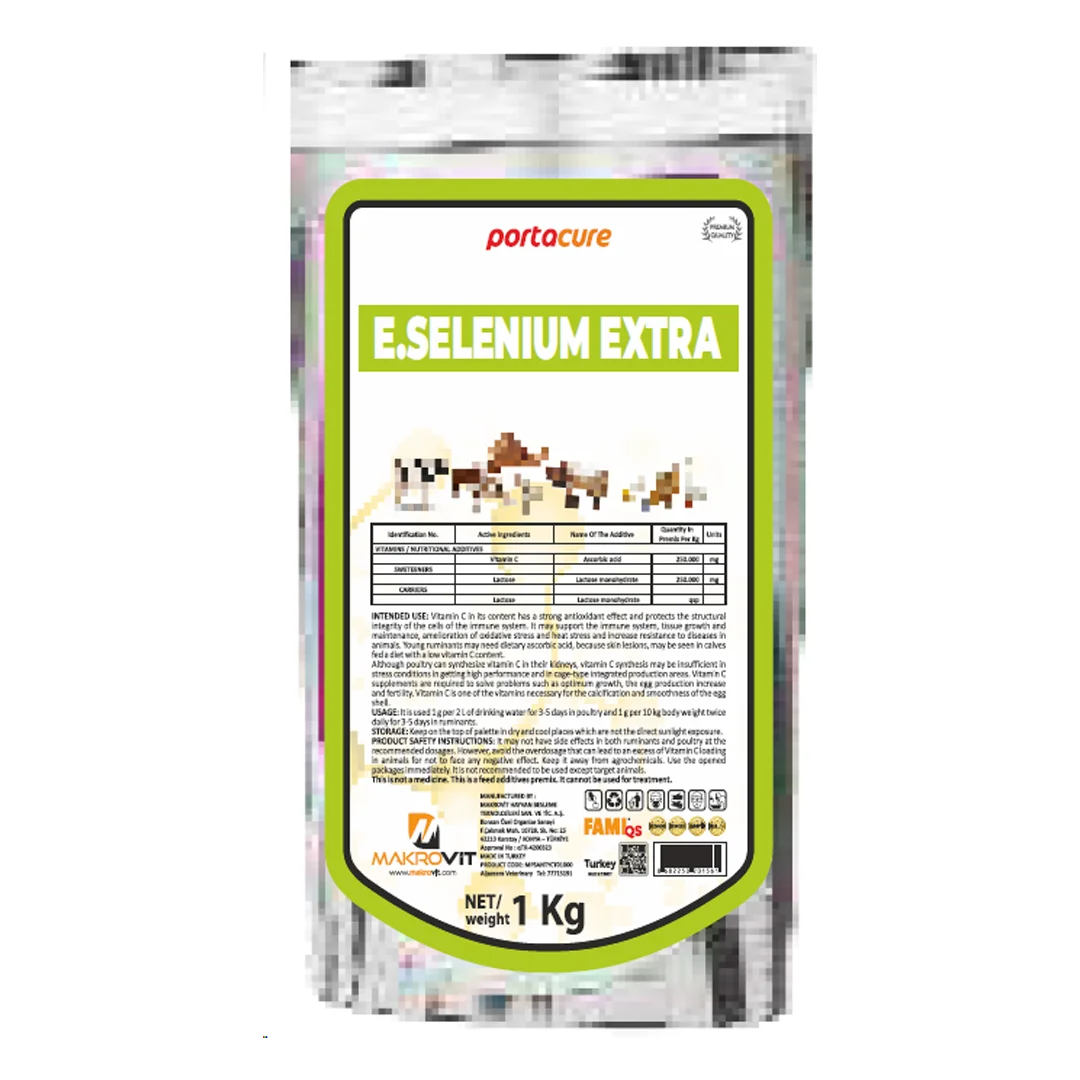 Kullanım Amacı: Vitamin E ve selenyum ihtiyaçlarını karşılamak için kullanılır. Vitamin E ve selenyum, güçlü antioksidan kapasiteleri sayesinde doku hasarını önlemek için gerekli antioksidanlardır. Üreme, kas, dolaşım, sinir ve bağışıklık sistemlerinin fonksiyonlarını iyileştirir. Yumurtlama oranını destekler ve ölüm oranını azaltır. Selenyum ve vitamin E içeriği, oksidatif stresin önlenmesine ve/veya hafifletilmesine yardımcı olabilir. Ayrıca, normal büyüme ve verimlilik için gereklidir ve sağlık durumunu iyileştirir, süt ineklerinde plasentanın kalması, metrit ve mastit risklerini azaltabilir. Kullanım: Kanatlı hayvanlar için 100-150 gramı 1000 litre içme suyuna ve 150-300 gramı 1000 kilogram yeme karıştırılarak, geviş getiren hayvanlar için ise 25-75 gramı 1000 litre içme suyuna ve 250-600 gramı 1000 kilogram yeme karıştırılarak kullanılır.
