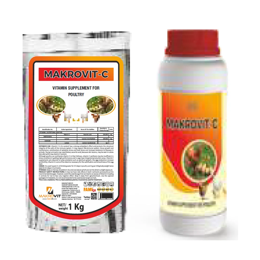 Kullanım Amacı: Kanatlılar böbreklerinde C vitamini sentezleyebilse de, yüksek performans elde etme ve kafes tipi entegre üretim alanlarında stres koşullarında bu sentez yetersiz kalabilir. Optimum büyüme, yumurta üretim artışı ve verimlilik gibi sorunları çözmek için C vitamini takviyesine ihtiyaç duyulur. C vitamini, yumurta kabuğunun kireçlenmesi ve pürüzsüzlüğü için gerekli vitaminlerden biridir. Makrovit C, bu sorunların çözülmesinde önemli bir destek sağlayacaktır. Kullanım: 1 gram, 10 litre içme suyuna karıştırılarak kullanılır.