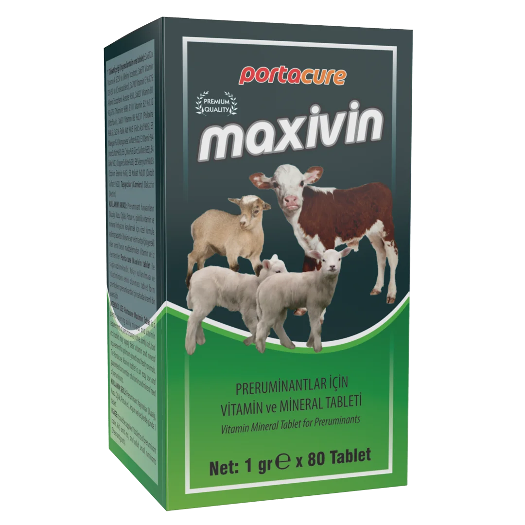 KULLANIM AMACI: Pre-ruminant hayvanlar (buzağı, kuzu, oğlak, deve yavrusu vb.) için yüksek düzeyde vitamin ve mineral içeren tamamlayıcı yemdir. Portacure Maxivin, büyüme ve verim artışı için gerekli olan vitamin ve iz mineral gibi temel besin maddelerini sağlar. Özel bir üretim prosesi ile üretilen tablet formu, kolay kullanımı ve tam tüketilmesi bakımından preruminantlar için önemli bir avantajdır. KULLANIM TALİMATI: Preruminant hayvanlar(buzağı, kuzu, oğlak, deve buzağısı vb.), koyun ve keçiler için günde1 tablet. Analitik Bileşenler: Ham protein: %0,20 - Ham yağ : %1,60 - Ham selüloz: %0,10 - Ham kül : %50,60 - Sodyum : 75 mg/kg - Nem : %2,50 Bileşen Listesi: Vitaminler (A Vitamini, D3 Vitamini, E Vitamini, B1 Vitamini, B2 Vitamini, B6 Vitamini, B9 Vitamini), İz Mineraller (Mangan sülfat, Demir Sülfat, Çinko Sülfat, Bakır Sülfat, Sodyum Selenit, Kobalt Sülfat), Dekstrin, Sorrbito, Sodyum Bikarbonat. Yem Katkı Maddeleri: Vitaminler/ Besinsel Yem Katkı Maddeleri 3a672a A Vitamini (Retinol asetat) 6.750 IU; 3a671 D3 Vitamini (Kolekalsiferol) 450 IU; 3a700E Vitamini (Alfa Tokoferol Asetat) %3,75; 3a820 B1 Vitamini (Tiyamin) %0,675; 3a825i B2 Vitamini (Riboflavin) %1,12; 3a831 B6 Vitamini (Piridoksin) %0,37; 3a316 B9 Vitamini (Folikasit)%0,3. İz Mineraller / Besinsel Yem Katkı Maddeleri 3b503 Mangan (Mangan Sülfat) %3; E172 Demir (Demir Sülfat) %4; 3b605 Çinko (Çinko Sülfat) %5; 3b405 Bakır (Bakır sülfat) %0,3; 3b801 Selenyum (Sodyum Selenit) %0,03; 3b305 Kobalt (Kobalt Sülfat)0,01%. Taşıyıcılar Dekstrin, E420 Sorbitol, E500 Sodyum Bikarbonat.