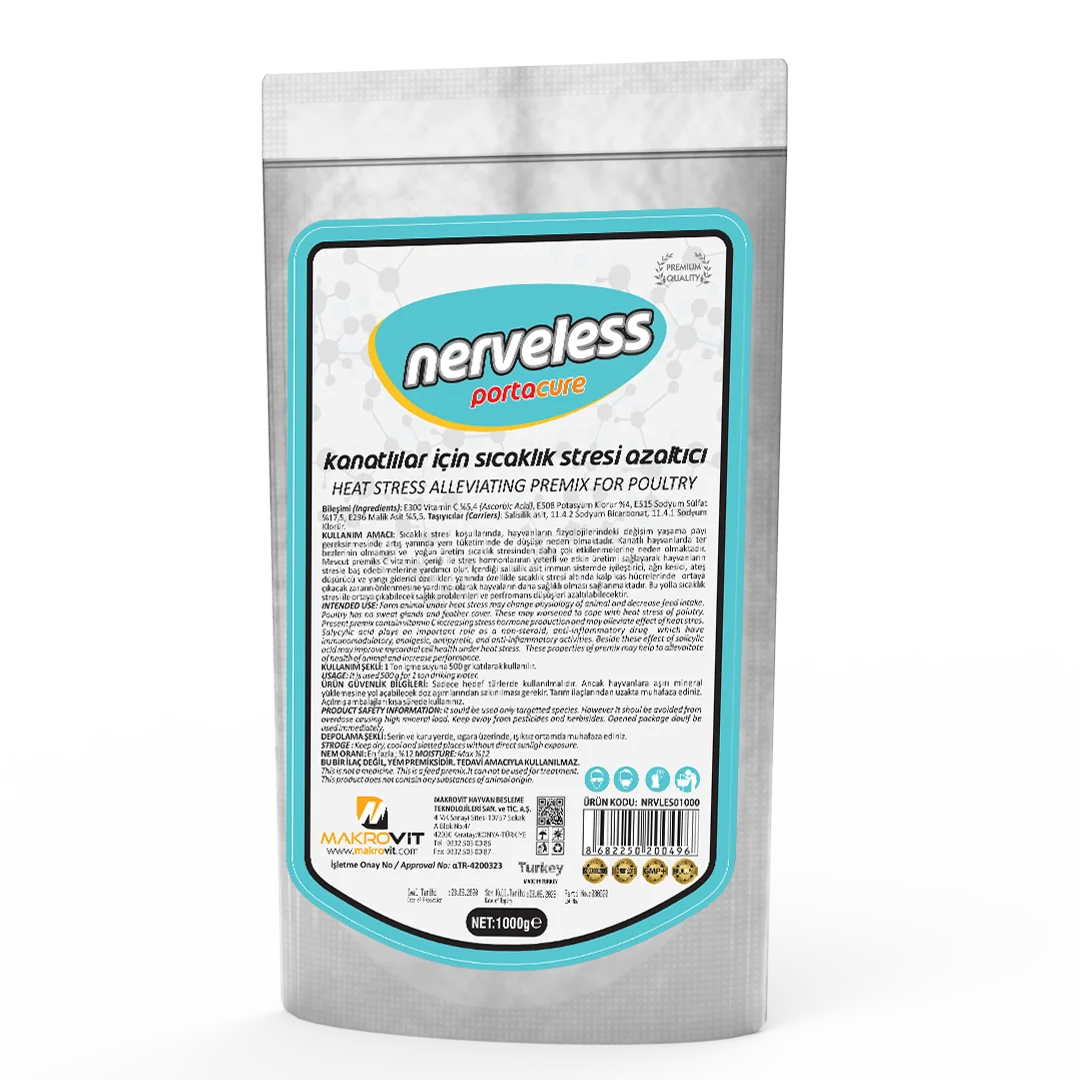 KULLANIM AMACI: Sıcaklık stresi koşullarında, hayvanların fizyolojilerindeki değişim yaşama payı gereksinmesinde artış yanında yem tüketiminde de düşüşe neden olmaktadır. Kanatlı hayvanlarda ter bezlerinin olmaması ve yoğun üretim sıcaklık stresinden daha çok etkilenmelerine neden olmaktadır. Mevcut premiks C vitamini içeriği ile stres hormonlarının yeterli ve etkin üretimi sağlayarak hayvanların stresle baş edebilmelerine yardımcı olur, İçerdiği salisilik asit immun sistemde iyileştirici, ağrı kesici, ateş düşürücü ve yangı giderici özellikleri yanında özellikle sıcaklık stresi altında kalp kas hücrelerinde ortaya çıkacak zararın önlenmesine yardımcı olarak hayvanların daha sağlıklı olması sağlanmaktadır. Bu yolla sıcaklık stresi İle ortaya çıkabilecek sağlık problemleri ve performans düşüşleri azaltılabilecektir. KULLANIM ŞEKLİ: 1 Ton İçme suyuna 500 gr katılarak kullanılır. BİLEŞİMİ: E300 Vitamin C %5,4 (AscorbicAcid), E508 Potasyum Klorur %4, E515 Sodyum Sülfat %17,5, E296 Malik Asit %5,5. Taşıyıcılar (Carriers): Salisilik asit, 11.4.2 Sodyum Bikarbonat, 11.4.1 Sodyum Klorür,