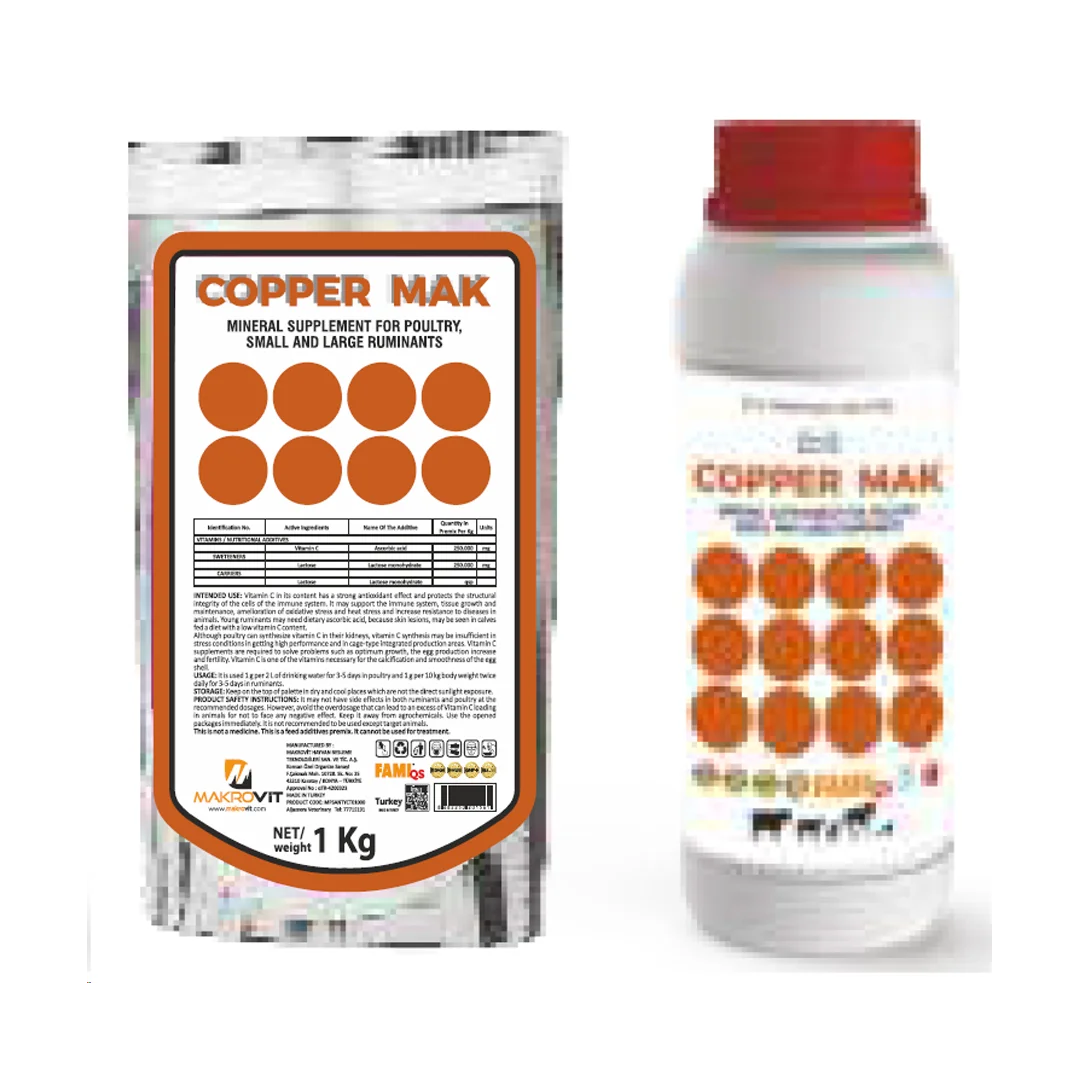 Kullanım Amacı: Kanatlı hayvanlar ve geviş getiren hayvanların bakır ihtiyacını karşılamak için kullanılır. Bakır eksikliği ile ilişkili semptomların iyileşmesine katkıda bulunur. Bakır (Cu), kanatlı hayvanlarda büyümeyi teşvik edici olarak da kullanılır. Diyetteki bakır ilavesi, kilo alımı, yemden yararlanma oranı (FCR) ve sindirim kanalındaki bakteriyel mikrofloranın değişimi üzerinde faydalı bir etki sağlar. Bakır, kanatlı hayvanların sağlığı ve büyümesinde stratejik bir rol oynar. Hastalık zorluklarını azaltır ve bağışıklık fonksiyonunu artırır. Kullanım: 1000-4000 litre içme suyuna 100 mg (2,5 - 10 ppm) karıştırılarak kanatlı hayvanlar için, büyükbaş hayvanlar için 1000 litre içme suyuna 20 mg, küçükbaş hayvanlar için ise bakırın toksik etkisi olduğundan ihtiyaç halinde 1000 litre içme suyuna 10 mg karıştırılarak kullanılır.