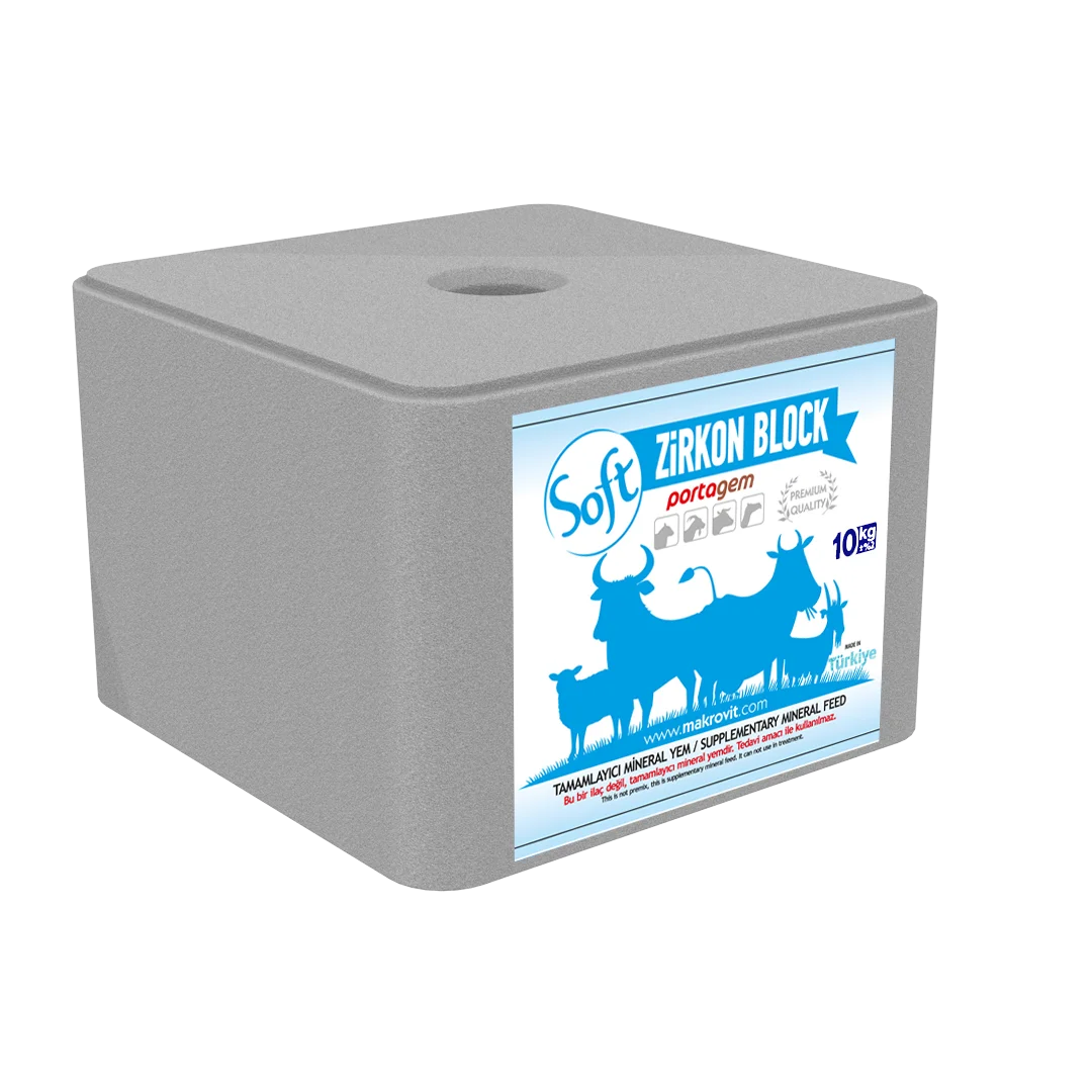 KULLANIM AMACI: Süt ve besi hayvanlarının vitamin (örneğin A, D ve E) ve mineral ihtiyaçlarının dengeli bir şekilde karşılanması için özel olarak hazırlanmış soda içeriği de olan bir yalama bloğudur. Portagem Zirkon yalama blokları, rasyonlarda vitamin mineral eksikliği olan durumlarda hayvanlara istemli olarak tüketime izin verildiğinde süt veriminde ve canlı ağırlık kazancında iyileşme sağlar. Portagem Zirkon kullanılan hayvanda; mineral eksikliğinde ortaya çıkan pikayı (taş, toprak, kemik, poşet, bez vs. Yeme yalama davranışı) önler. İstemli tüketim sağlandığı için her yaştaki ve fizyolojik durumdaki hayvanların mineral ihtiyaçları dengeli bir şekilde karşılanabilir. Tuz içeriği nedeniyle su tüketimini ve sindirimi iyileştirebilir. KULLANIM ŞEKLİ: Besi sığırı, sağmal inek, deve, koyun , keçi buzağı, kuzu ve oğlakların mineral madde ihtiyaçlarını karşılamak amacıyla kullanılır. Hayvanların kolayca ulaşabilecekleri yerlere asılarak yada önlerine konularak kullanılması tavsiye edilir. Tüm hava koşullarına dayanıklı özel formulasyonu sayesinde erimez ve dağılma yapmaz. UYARILAR: Ürün depolanırken yada kullanım esnasında kar, yağmur, dolu gibi hava olaylarından korunmalı, mümkün mertebe ıslak olmayan nem almayan alanlarda muhafaza edilmelidir. Bileşenler: Sodyum Klorür, Magnezyum Oksit, Dikalsiyum Fosfat, İz mineral Premiksi.
