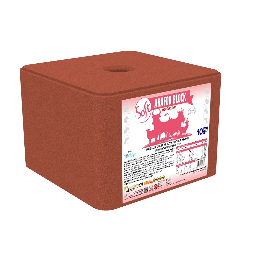 KULLANIM AMACI: Anafor Block her yaştaki fizyolojik durumdaki ruminantların mineral ihtiyaçlarının karşılanması için özel olarak formüle edilmiş bir yalama bloğudur. Anafor kullanılan hayvanda; mineral eksikliğinde ortaya çıkan pikayı (taş, toprak, kemik, poşet, bez vs yeme yalama davranışı) önler. Tuz içeriği nedeniyle su tüketimini ve sindirimi iyileştirebilir. İstemli tüketim sağlandığı için her yaştaki ve fizyolojik durumdaki hayvanların mineral ihtiyaçları dengeli bir şekilde karşılanabilir. KULLANIM ŞEKLİ: Besi sığırı, sağmal inek, deve, koyun , keçi buzağı, kuzu ve oğlakların mineral madde ihtiyaçlarını karşılamak amacıyla kullanılır. Hayvanların kolayca ulaşabilecekleri yerlere asılarak yada önlerine konularak kullanılması tavsiye edilir. Tüm hava koşullarına dayanıklı Özel formülasyonu sayesinde erimez ve dağılma yapmaz. UYARILAR: Ürün depolanırken yada kullanım esnasında kar, yağmur, dolu gibi hava olaylarından korunmalı, mümkün mertebe ıslak olmayan nem almayan alanlarda muhafaza edilmelidir. Bileşenler: Sodyum Klorür, Magnezyum Oksit, Dikalsiyum Fosfat, İz mineral Premiksi.