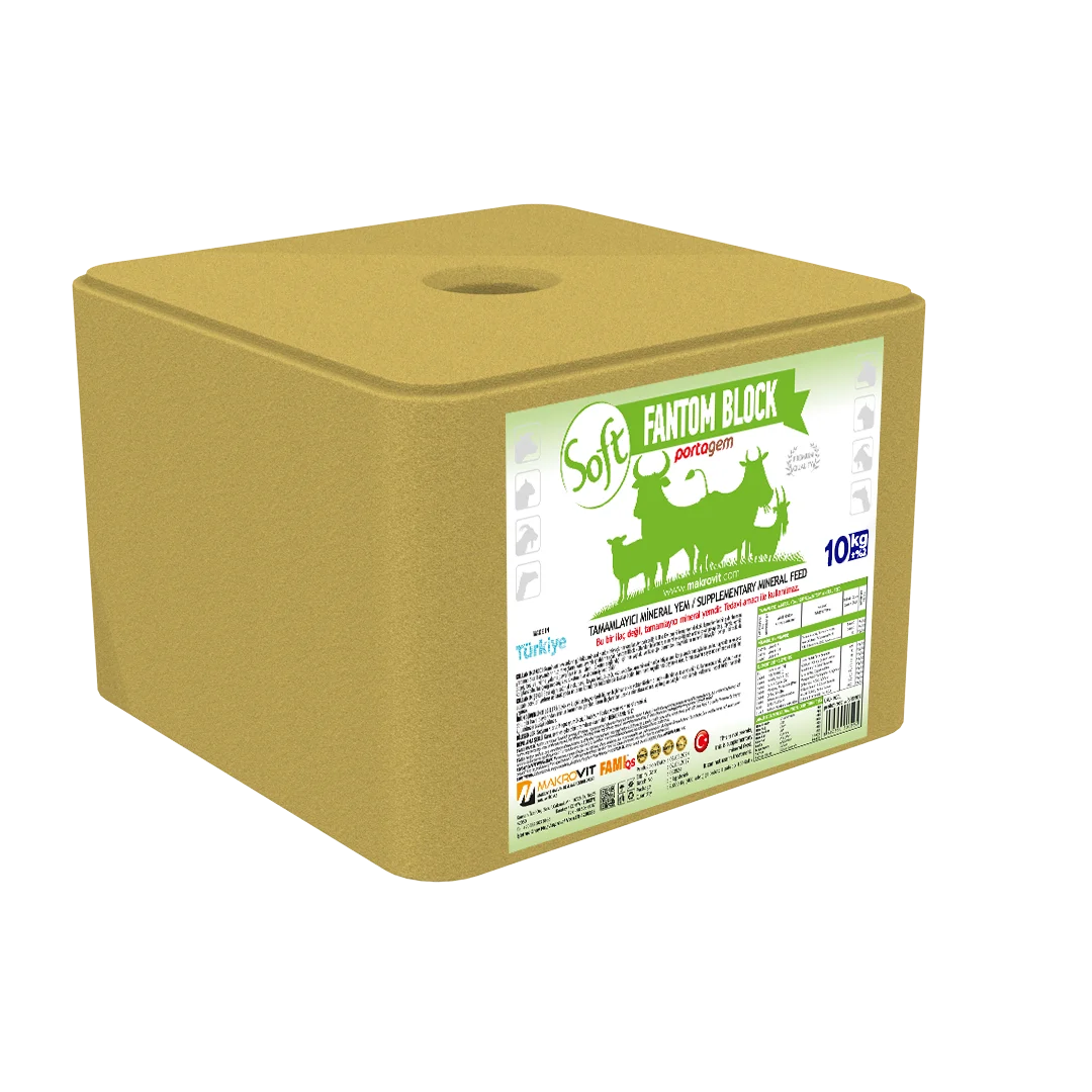 KULLANIM AMACI: Ruminant hayvanların günlük iz mineral madde ihtiyaçlarını karşılar. Ayrıca içerdiği A, D ve E vitamini ile muhtemel eksiklik problemlerinin giderilmesine yardımcı olur, Hayvanların tuz ihtiyaçlarını karşılayarak iştahlarını açar. Fantom Block kullanılan hayvanda; mineral eksikliğinde ortaya çıkan pikayı (taş, toprak, kemik, poşet, bez vs yeme yalama davranışı) önler, İstemli tüketim sağlandığı için her yaştaki ve fizyolojik durumdaki hayvanların mineral ihtiyaçları dengeli bir şekilde karşılanabilir. Tuz içeriği nedeniyle su tüketimini ve sindirimi iyileştirebilir, KULLANIM ŞEKLİ: Besi sığırı, sağmal inek, deve, koyun , keçi , buzağı, kuzu ve oğlakların mineral madde ihtiyaçlarını karşılamak amacıyla kullanılır. Hayvanların kolayca ulaşabilecekleri yerlere asılarak yada önlerine konularak kullanılması tavsiye edilir. Tüm hava koşullarına dayanıklı özel formülasyonu sayesinde erimez ve dağılma yapmaz. UYARILAR: Ürün depolanırken yada kullanım esnasında kar, yağmur, dolu gibi hava olaylarından korunmalı, mümkün mertebe ıslak olmayan nem almayan alanlarda muhafaza edilmelidir. Bileşenler: Sodyum Klorür, Magnezyum Oksit, Dikalşiyum Fosfat, İz mineral Premiksi.